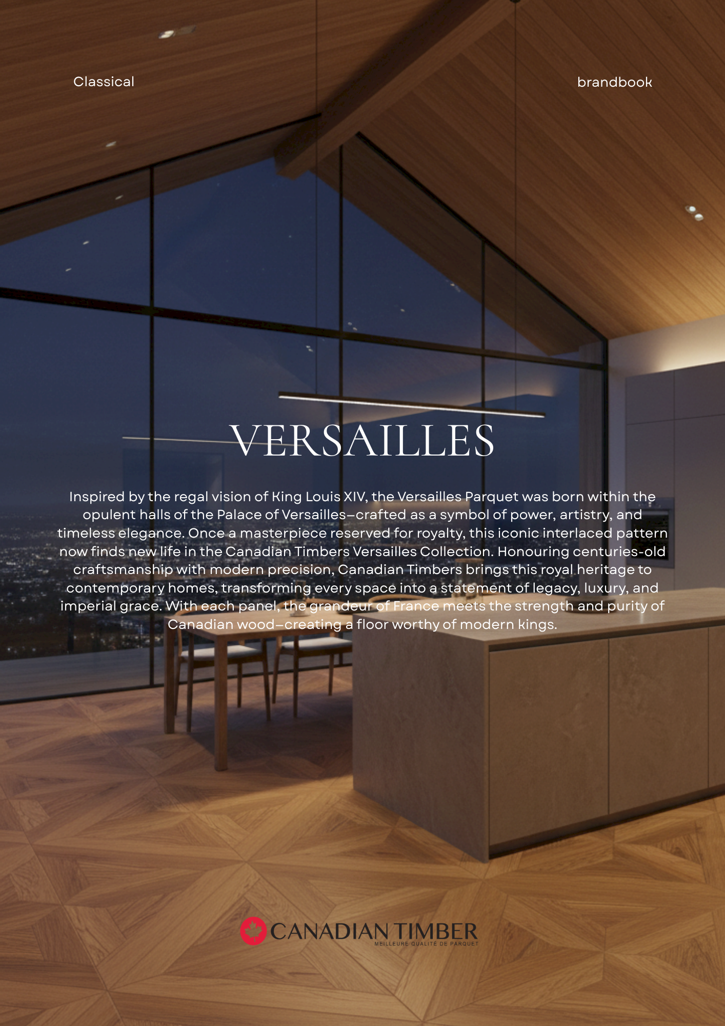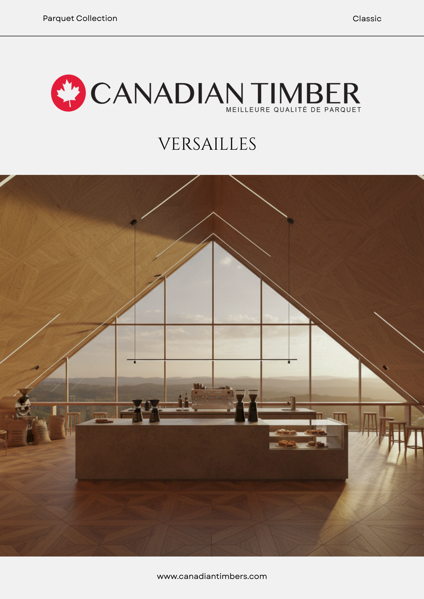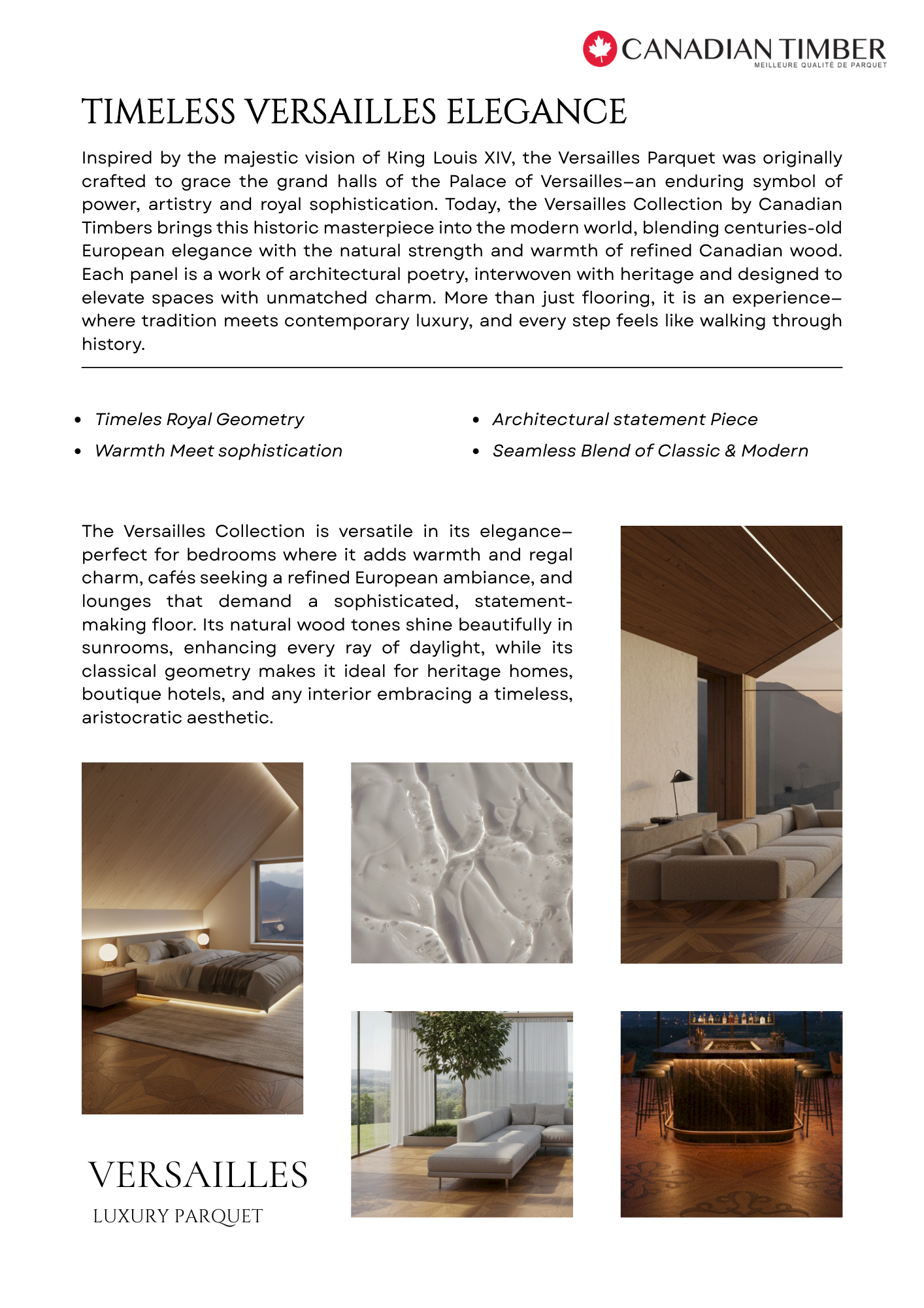 Discover the Versailles Collection by Canadian Timbers—luxury parquet flooring inspired by the royal halls of King Louis XIV. Crafted with iconic French geometry and warm Canadian wood, perfect for bedrooms, cafés, lounges, sunrooms, and classical interiors.
